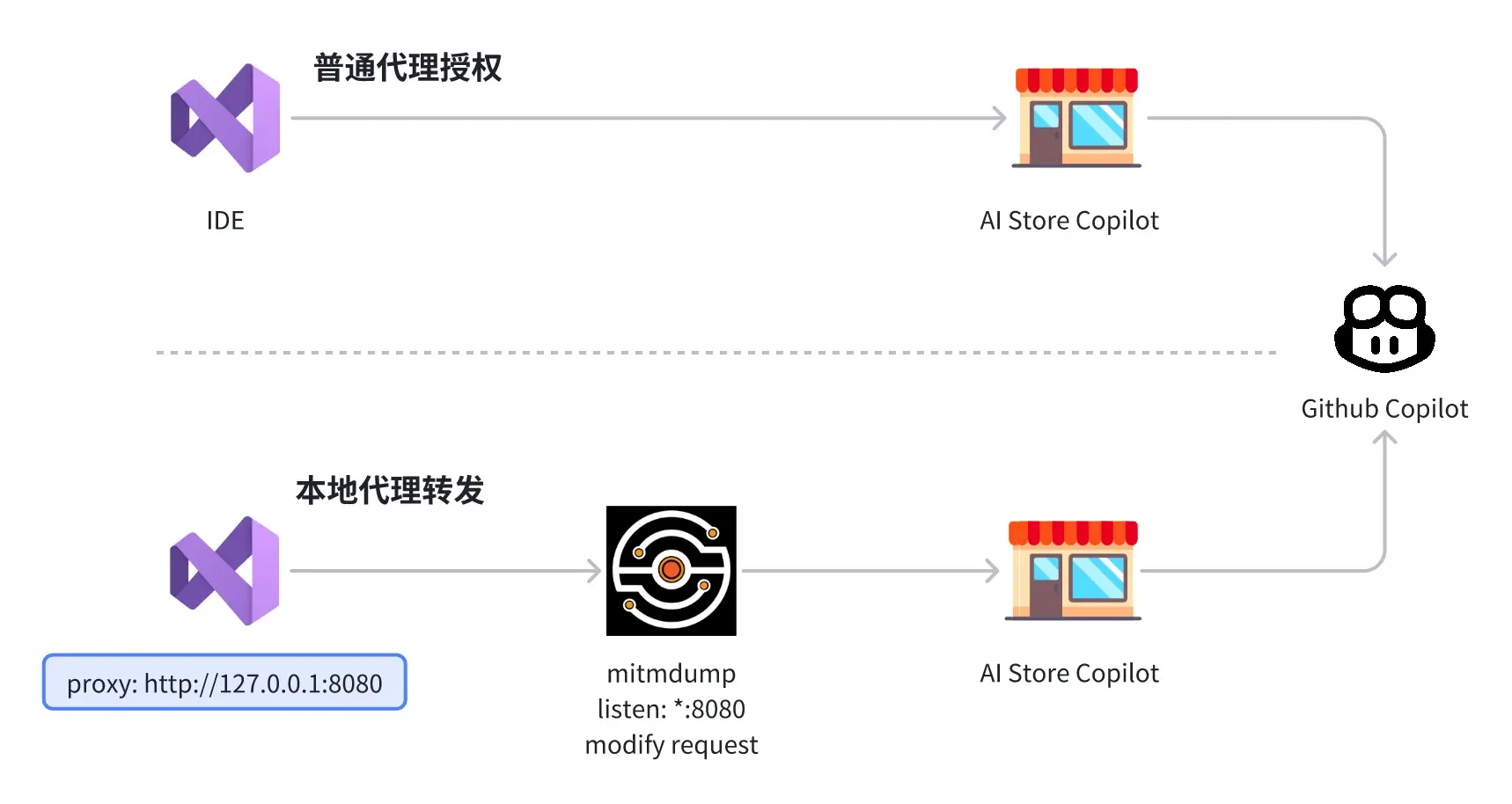 本地代理转发方法在客户端与 AI杂货铺 Copilot 之间加了一层本地代理,本地代理的作用是修改客户端向 github 发送的 鉴权/代码补全/对话 等请求(主要修改了 host 和 鉴权token,将其替换为 AI杂货铺 的 host 和 token)。