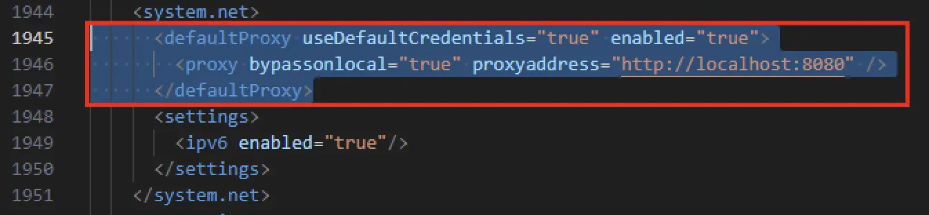 devenv.exe.config,ctrl + f查找关键词<system.net>,添加下面的配置:xml<defaultProxy useDefaultCredentials="true" enabled="true"> <proxy bypassonlocal="true" proxyaddress="http://127.0.0.1:8080" /> </defaultProxy>其中,